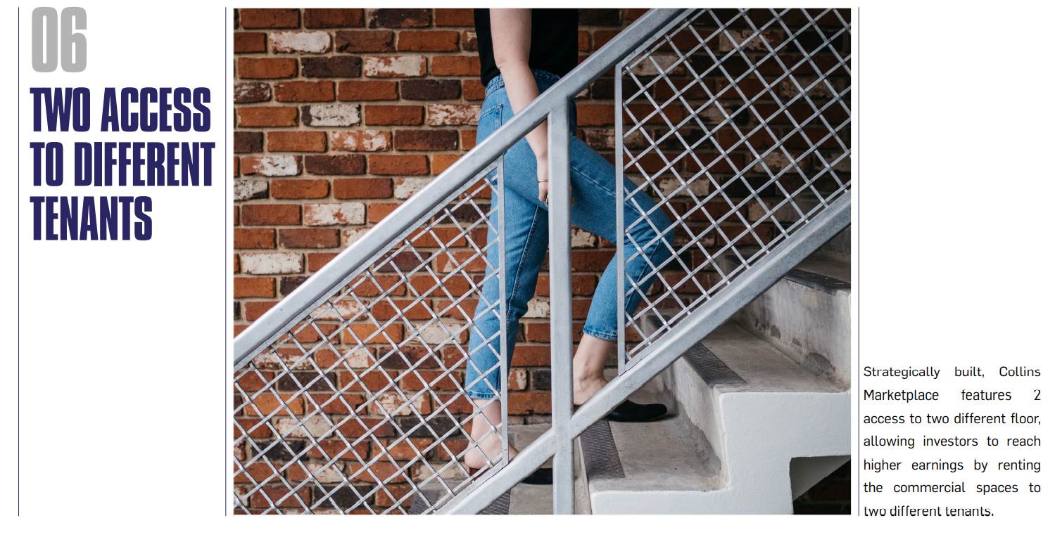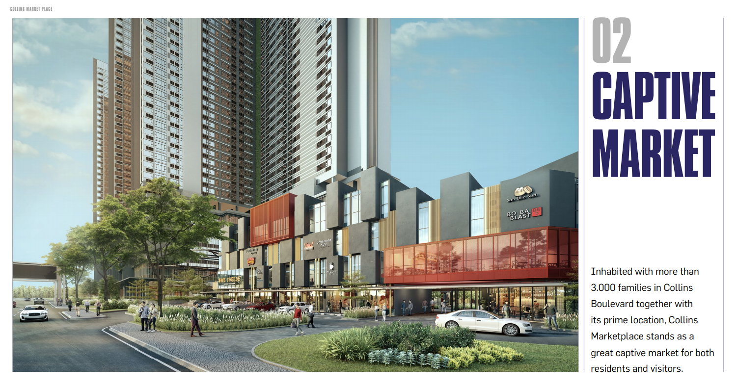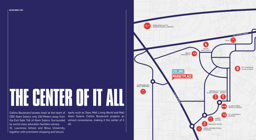 Collins Market Place berada di pinggir jalan raya serpong dengan akses toll Jakarta Tangerang cuma 500 meter In dan Out (jalan Utama serpong) dan mempunyai captive market 3000 unit apartemen yang berada di sebelah nya, menjadikan Ruko collins market sangat cocok untuk investasi dan buka usaha makanan atau minuman.